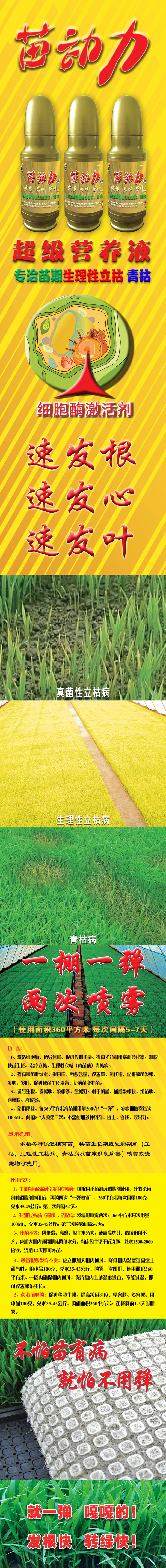 水稻各種保溫棚育苗,秧苗生長期或髮(fa)病期間(jian)(立枯、生理(li)性立枯病、青枯病及苗牀多髮(fa)病(bing)害)噴霧或澆施均可施用。