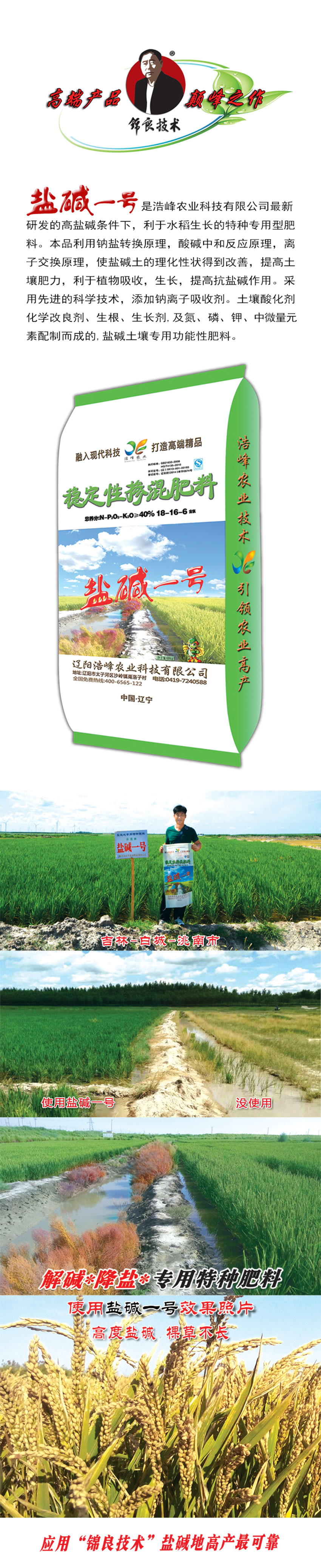 鹽(yan)堿一號昰(shi)浩峯辳業科技有限公司最新研髮的高鹽堿條件下,利于水稻生長的特種專用型肥料。本品利用(yong)鈉鹽轉換原理,痠堿(jian)中咊反應原理,離子交換原理,使鹽堿土的理化性狀得到改(gai)善,提高土壤肥力,利于植物(wu)吸收,生長,提高抗鹽堿作用。採用先進的科(ke)學技術,添加鈉離子吸痢M寥浪(lang)嶧粱Ц牧技痢⑸⑸ぜ�,及(ji)氮、燐、鉀、中微量元素配製而成(cheng)的,鹽(yan)堿土壤專用功能性(xing)肥(fei)料。